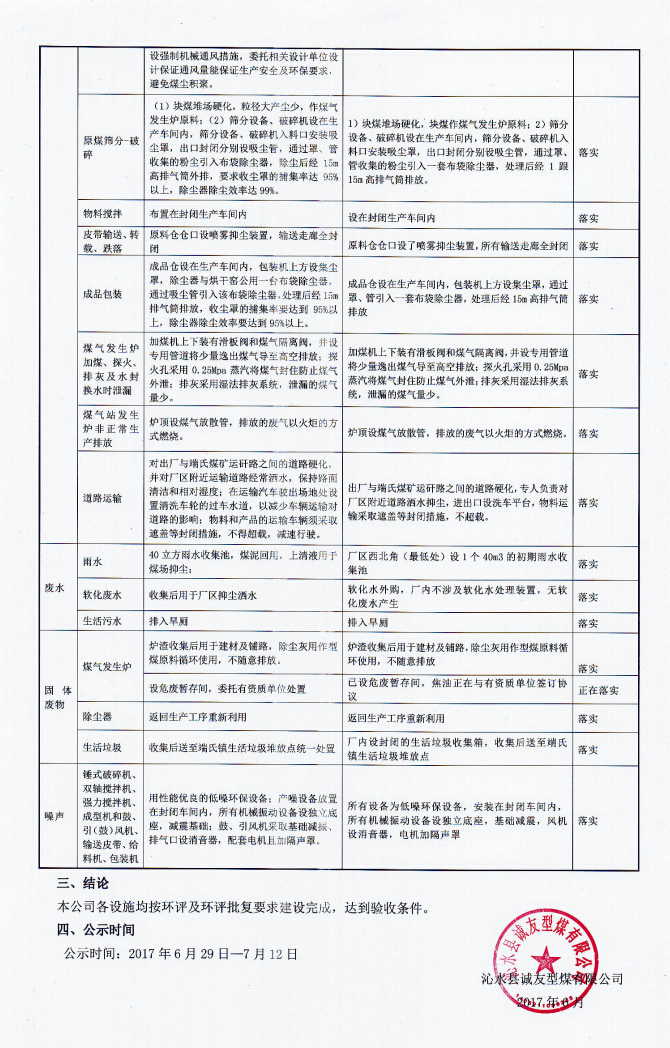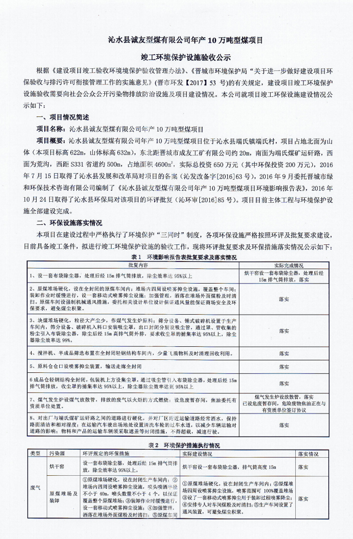 沁水縣誠友型煤有限公司年產(chǎn)10萬噸型煤項目竣工環(huán)境保護設施驗收公示